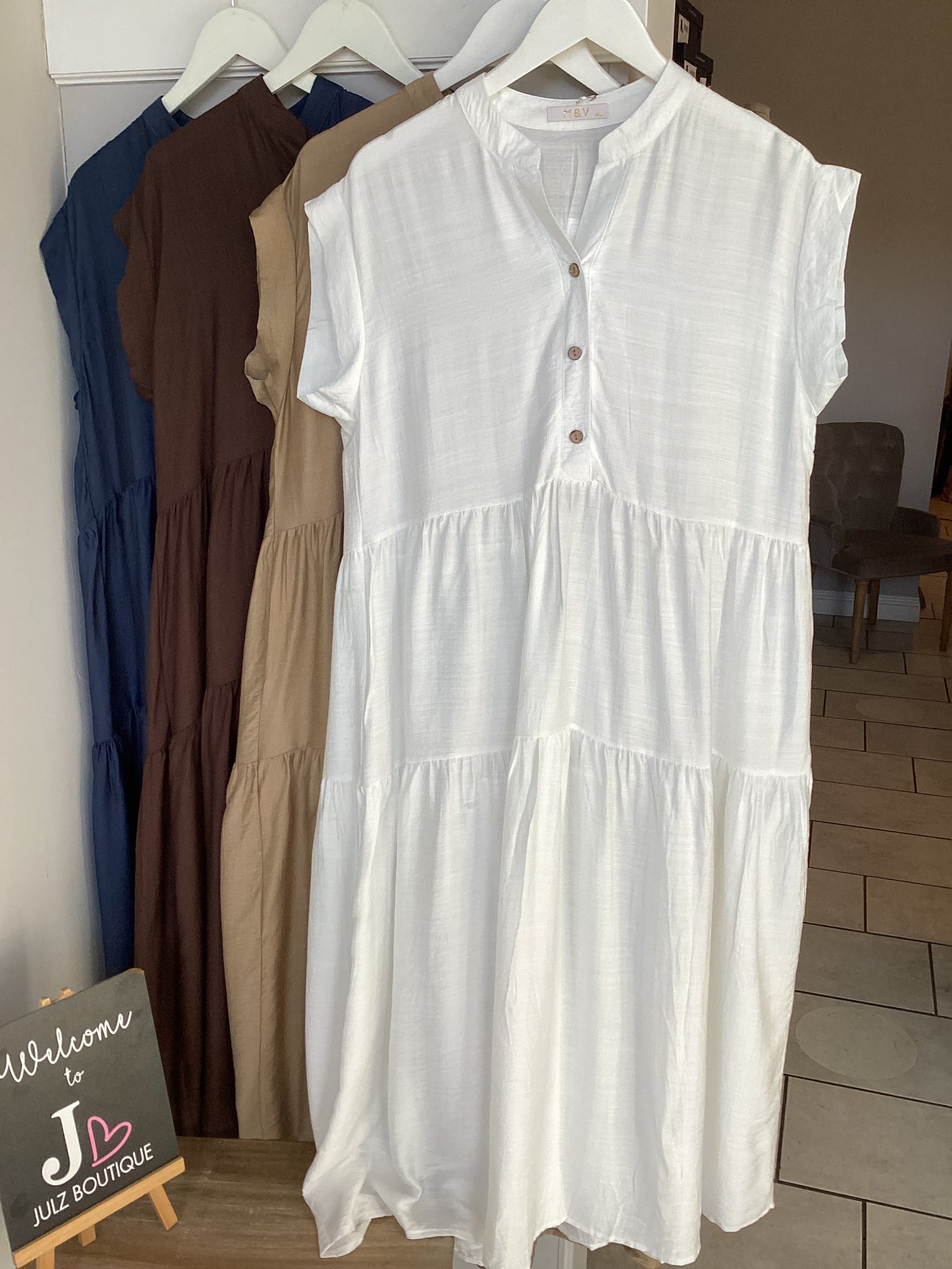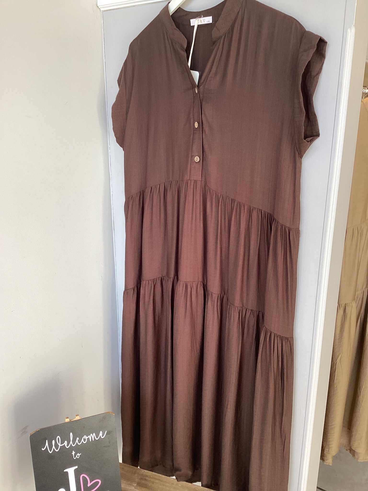Effortlessly elegant and endlessly wearable, the cap sleeved Tiered Midi Dress is your go-to for relaxed days with a touch of charm. Crafted from lightweight, breathable fabric, this dress features a soft V-neckline with natural wooden buttons, flattering tiered panels, and an easy sleeveless cut for all-day comfort. The flowy silhouette drapes beautifully, making it perfect for warm weather, holidays, or casual outings. Style it with sandals for a laid-back look or dress it up with wedges and accessories.