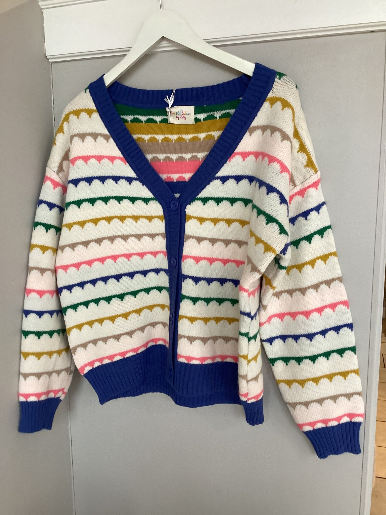 A beautifully crafted Colour wave Scallop Cardigan featuring soft, flowing rainbow stripes on a creamy knit base. Designed with a flattering V-neckline and button-through front, it’s finished with deep blue ribbed trims for a refined boutique feel. The relaxed fit and cosy knit make it perfect for effortless layering, adding a subtle pop of colour to everyday looks while keeping things polished and timeless.