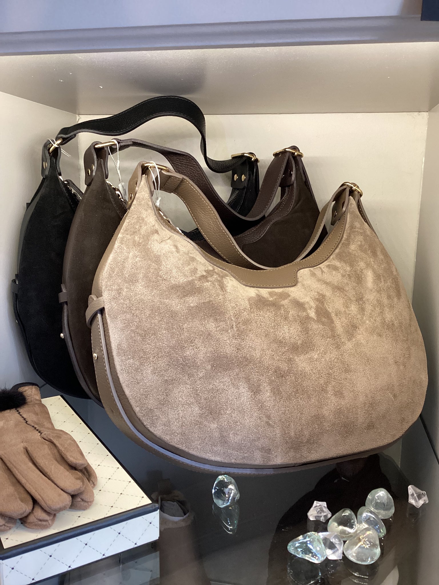 A stylish companion for a day at work though to a glamorous evening out, our Italian leather Crescent bags perfectly embody the latest trend for suede bags, oozing sophistication with spacious practicality.