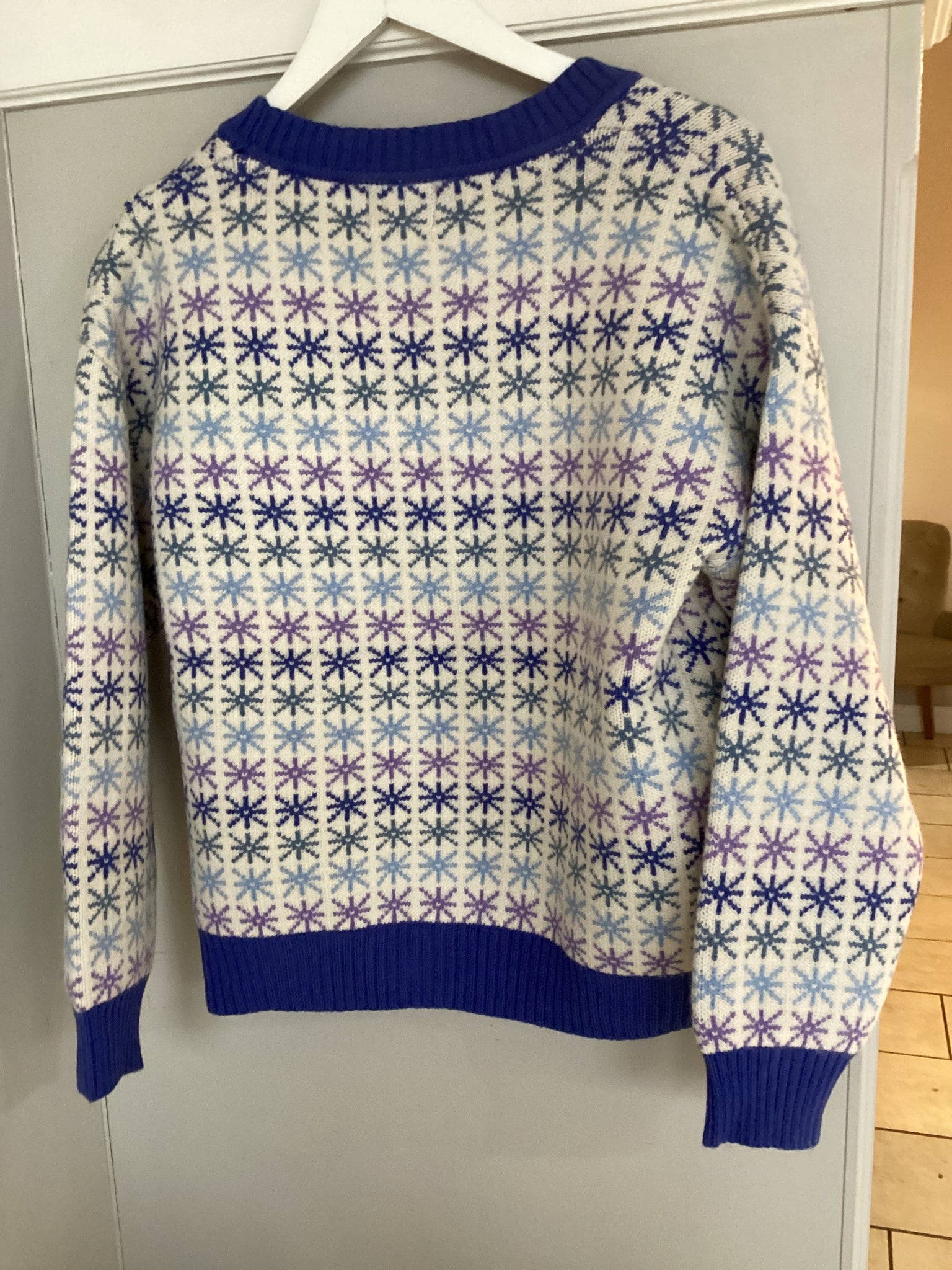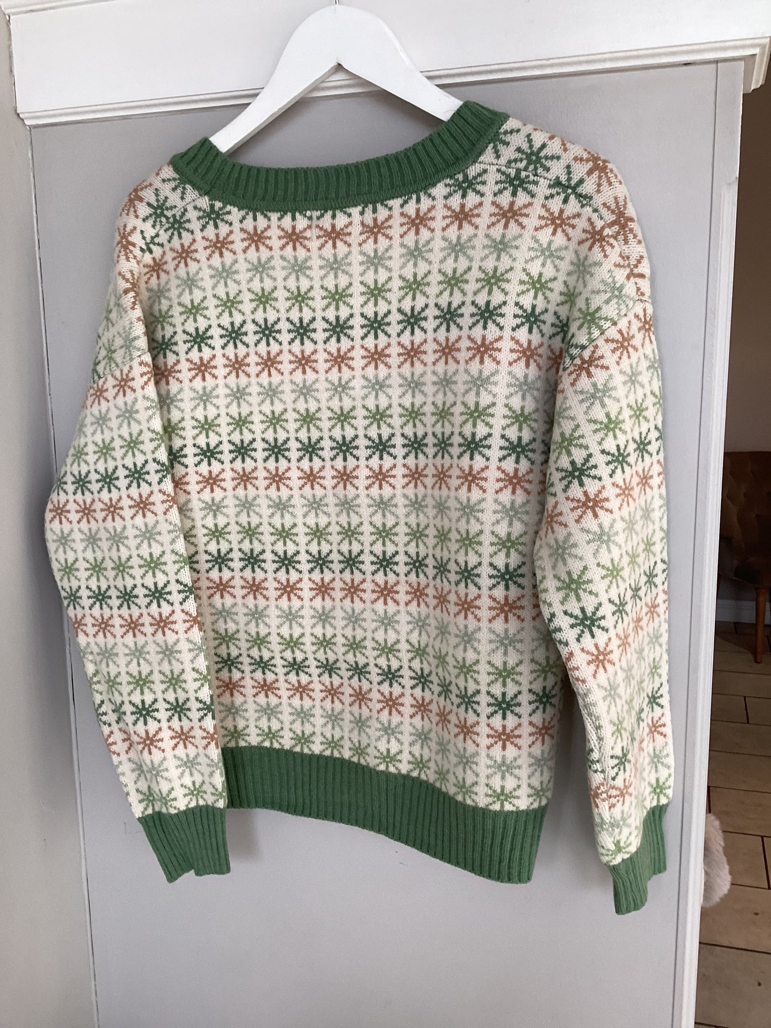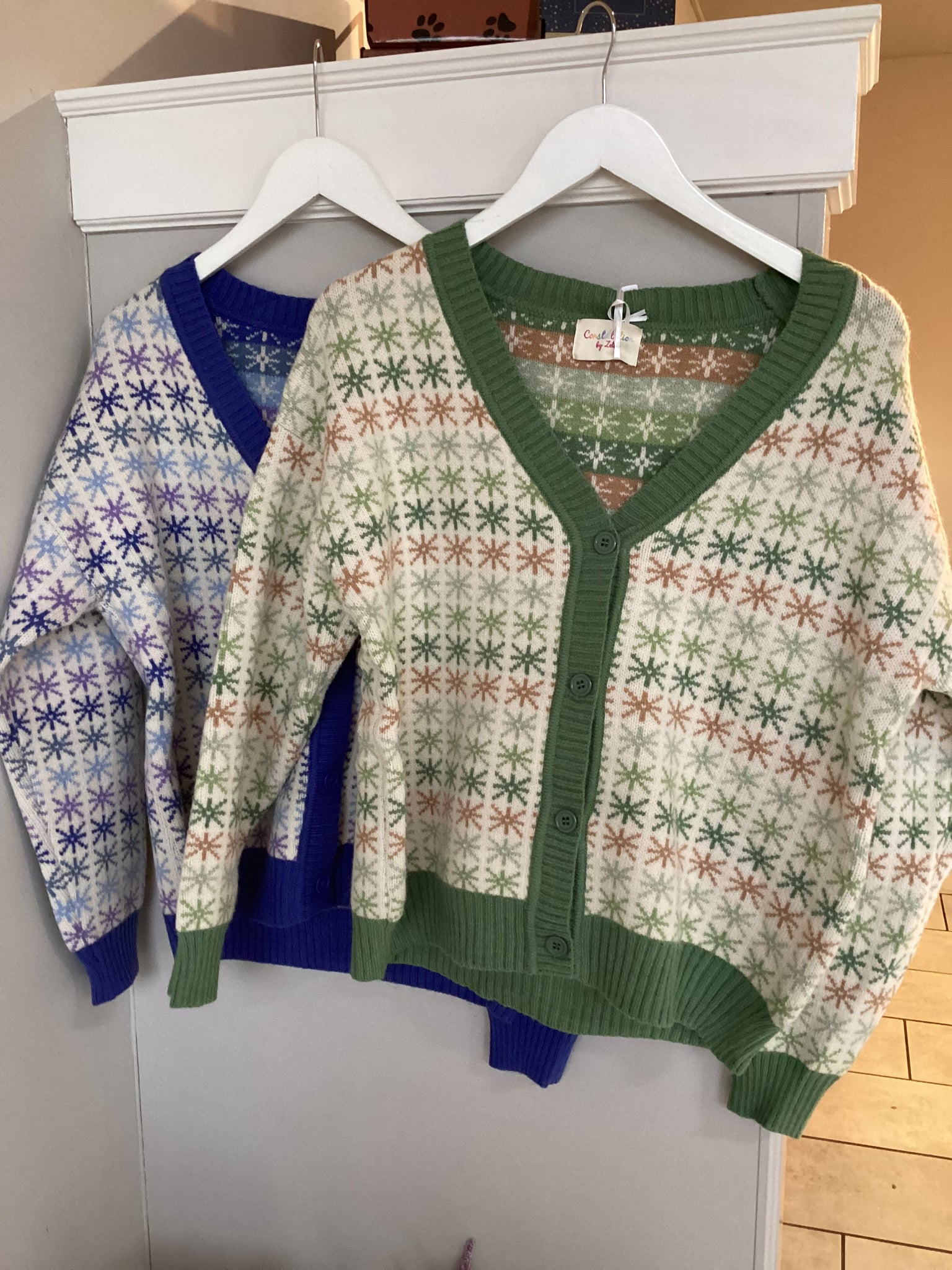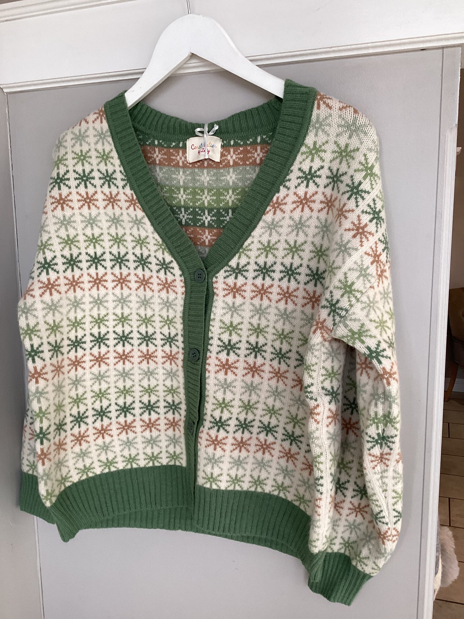 A charming boutique-style cardigan featuring a delicate all-over star motif in soft sage green and soft blue with warm tones on a creamy knit base. Designed with a classic V-neckline, button-through front, and finished with rich ribbed trims for a polished look. Cosy yet lightweight with a relaxed fit, this cardigan is perfect for effortless layering, adding a touch of vintage-inspired elegance to everyday outfits.