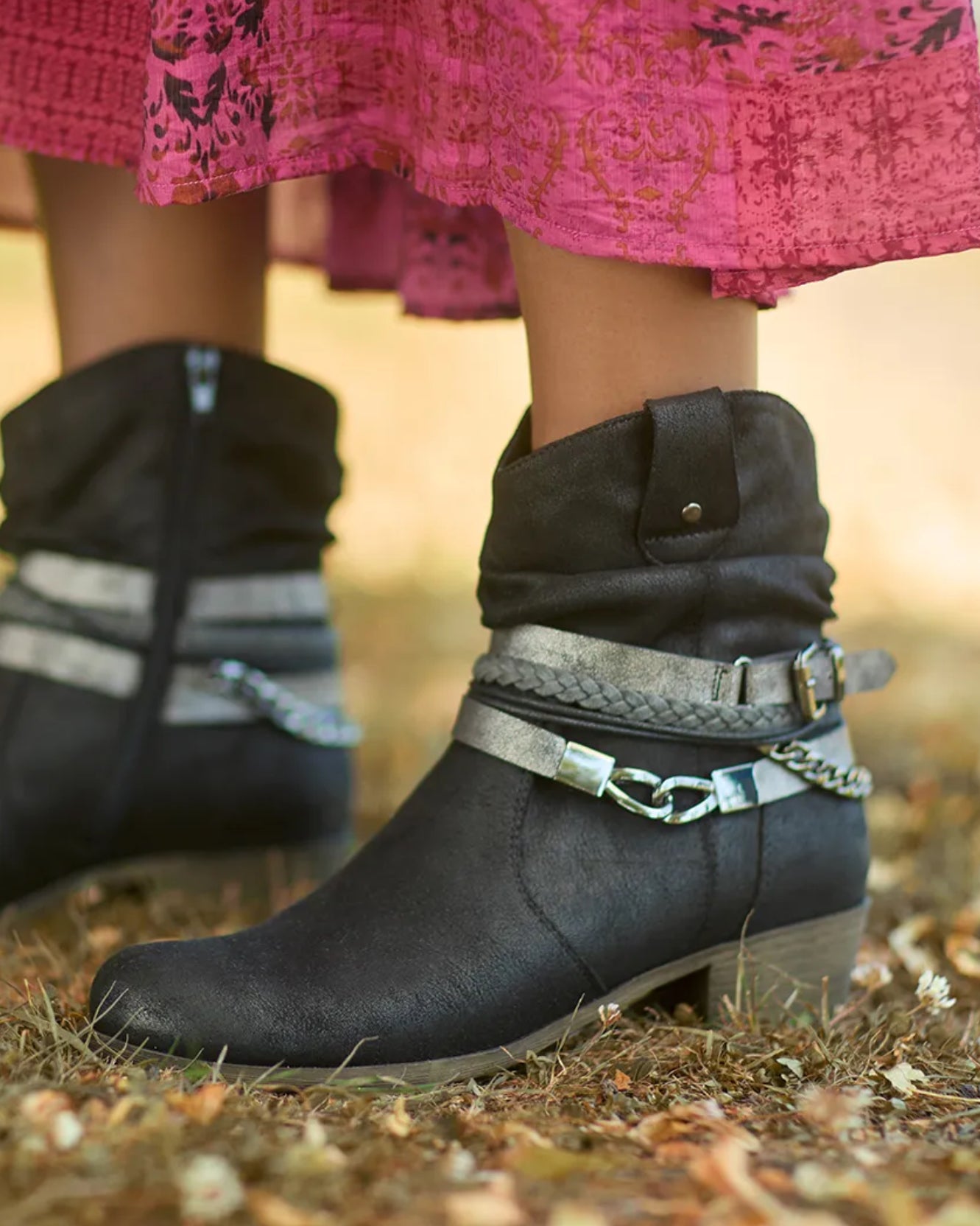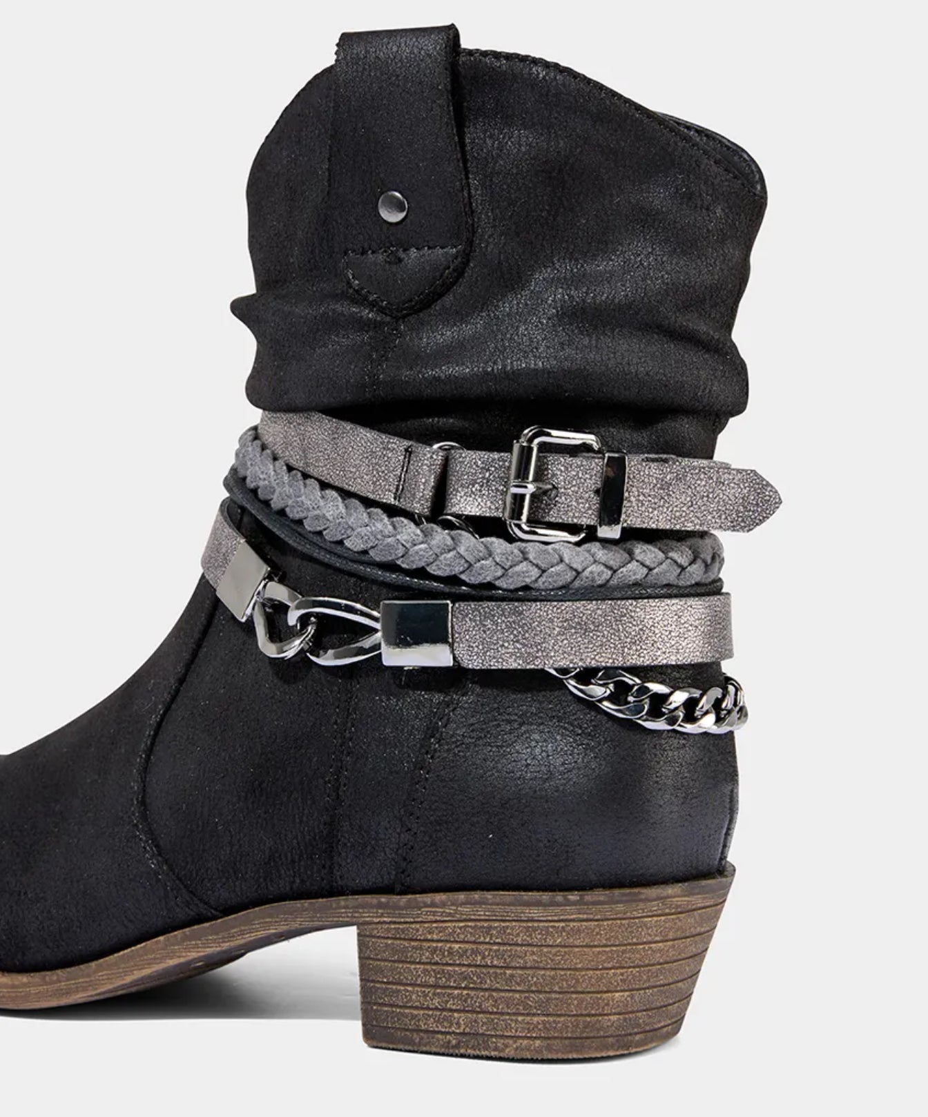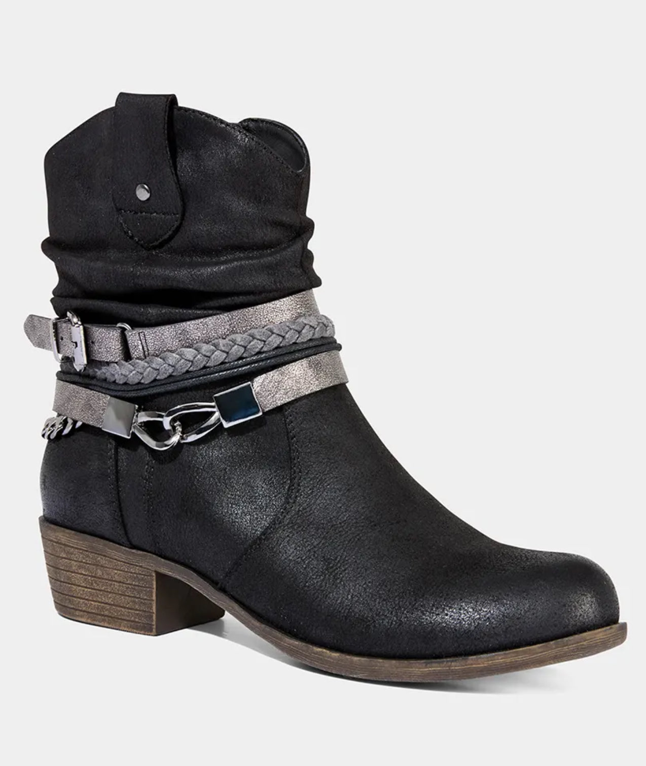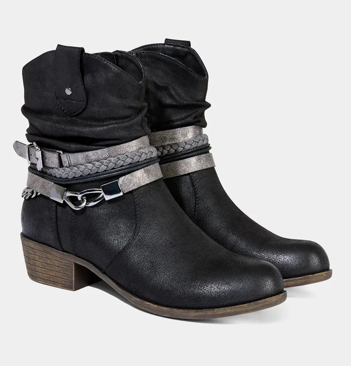 These tucker-style boots are all about the remarkable details. Featuring layered straps and plaited rope, they're perfect for bringing an effortless rock chick vibe to your winter looks. This unique footwear will wow with everything from your favourite jeans to a floaty dress, and looks even better with the matching bag.