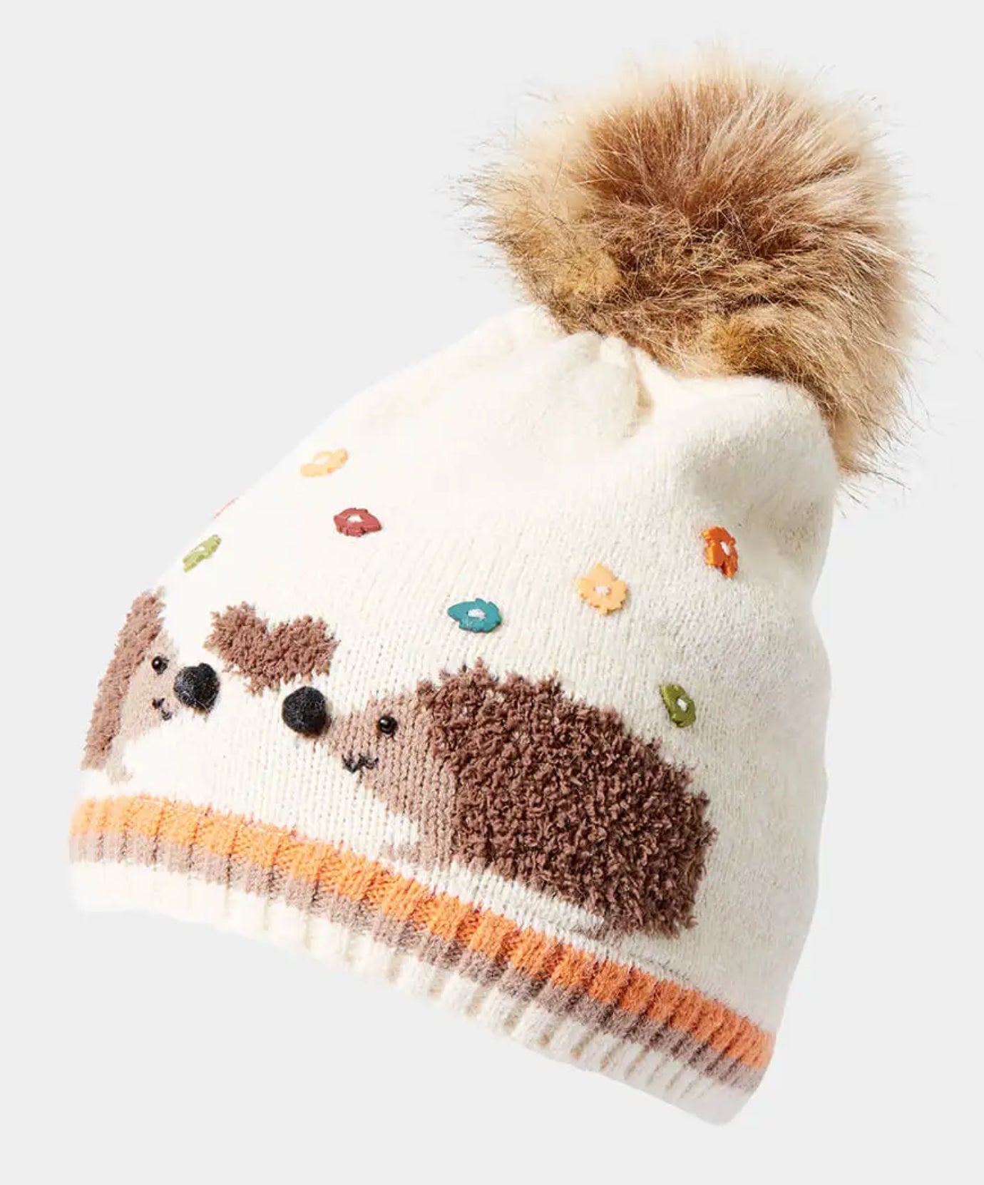 This knitted hat gives all the cosy vibes with its cute hedgehog and leaf design. So soft and snug, it'll always be ready for fun winter adventures!
