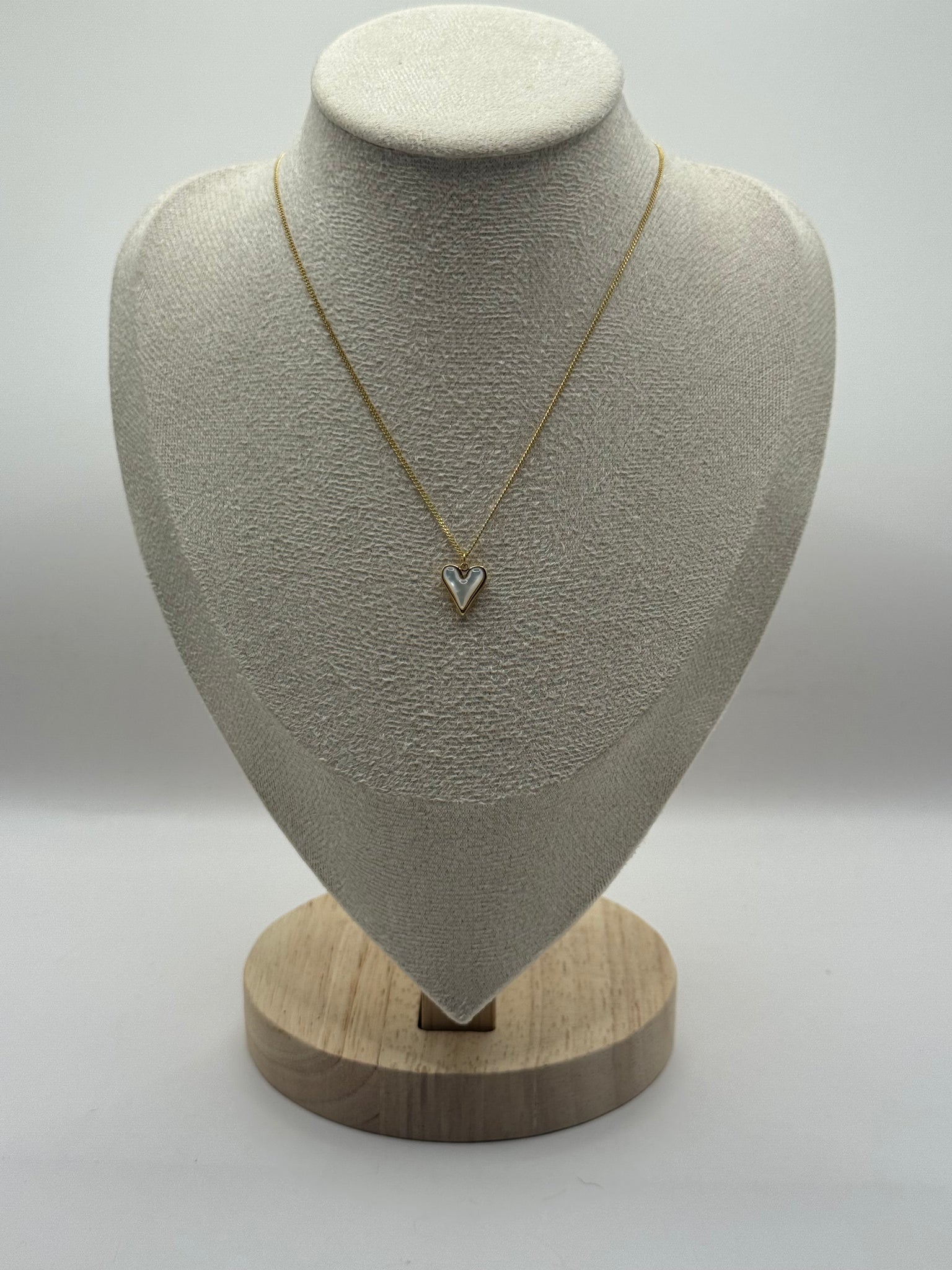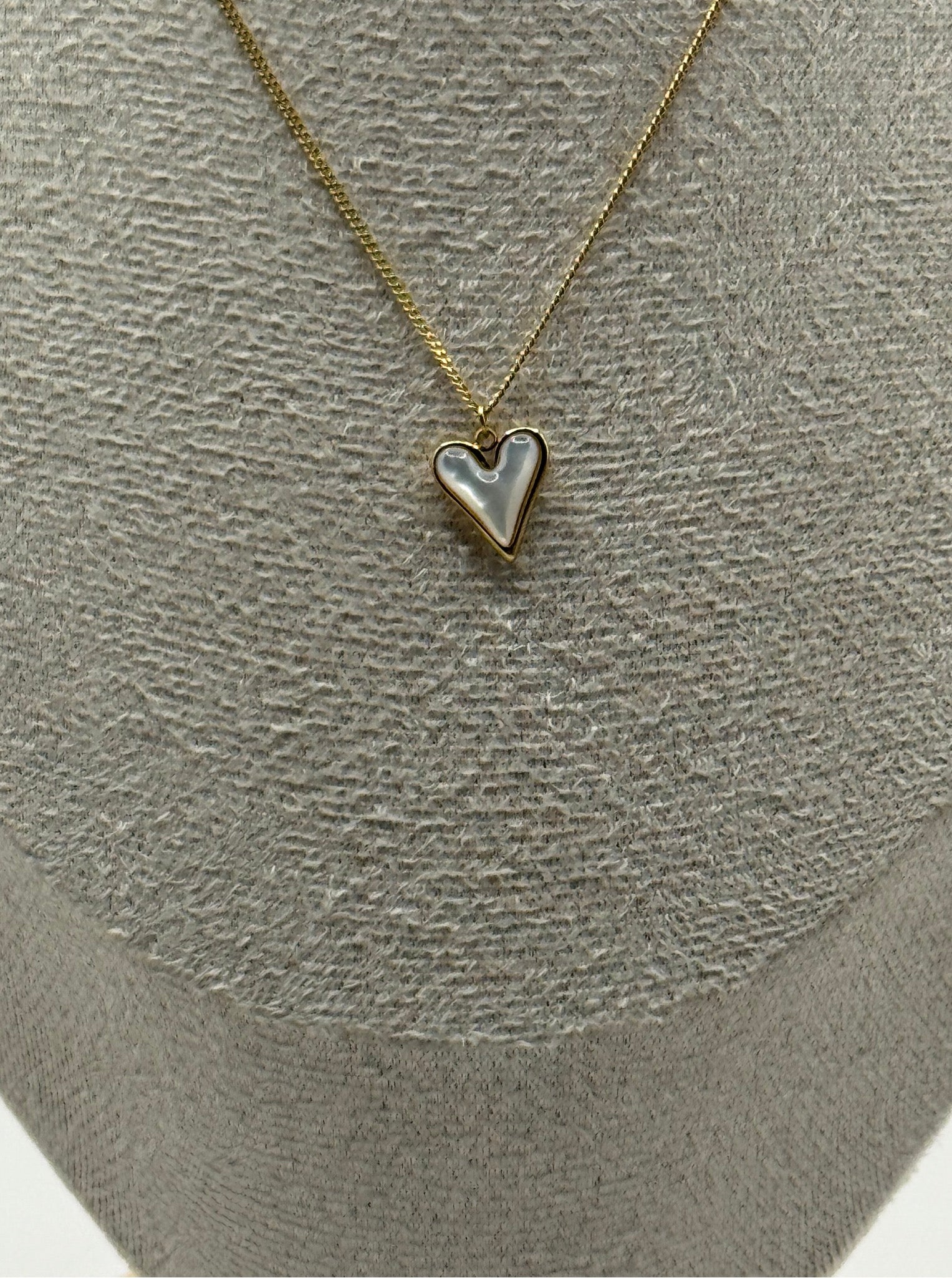 Mother-of-pearl heart charm gold necklace.
