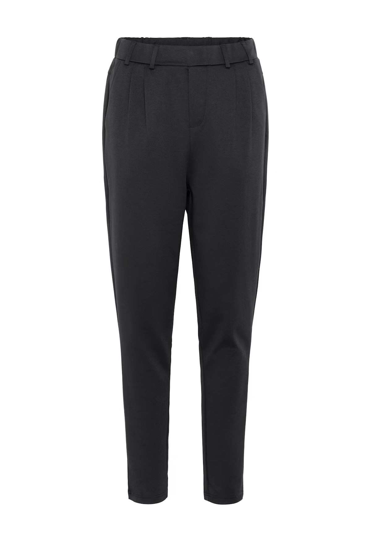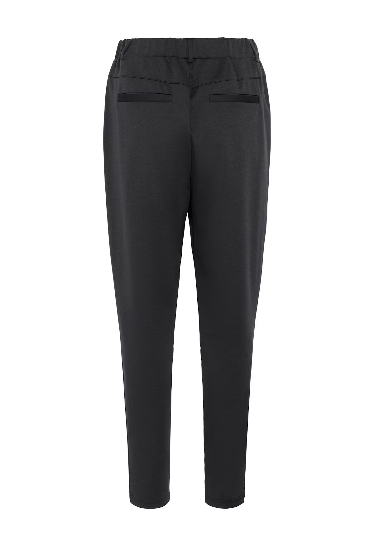 Tapered dark grey trousers with front pleats, smooth waistband, and added stretch for comfort. Features side pockets, back welt pockets, and elastic at the back waist. A clean and flexible piece for everyday or office wear.