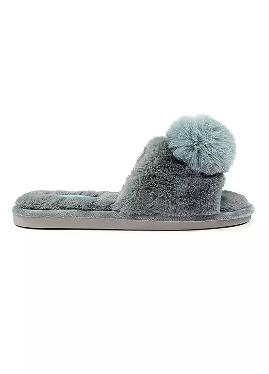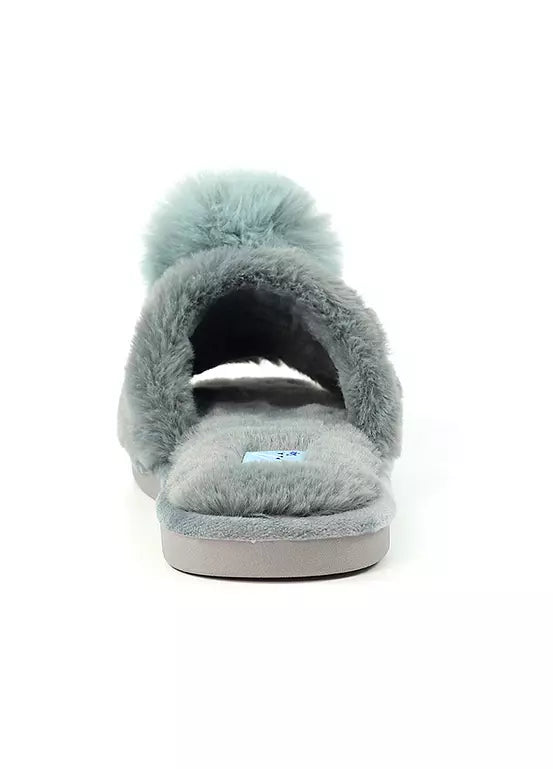 Experience luxurious comfort with our slip-on faux fur slipper, Cara, in grey. Soft and padded, it wraps your feet in comfort. Adorned with charming pom pom decoration at the front, it adds a playful touch. Super stylish and comfortable, these slippers are the perfect addition to your loungewear collection.