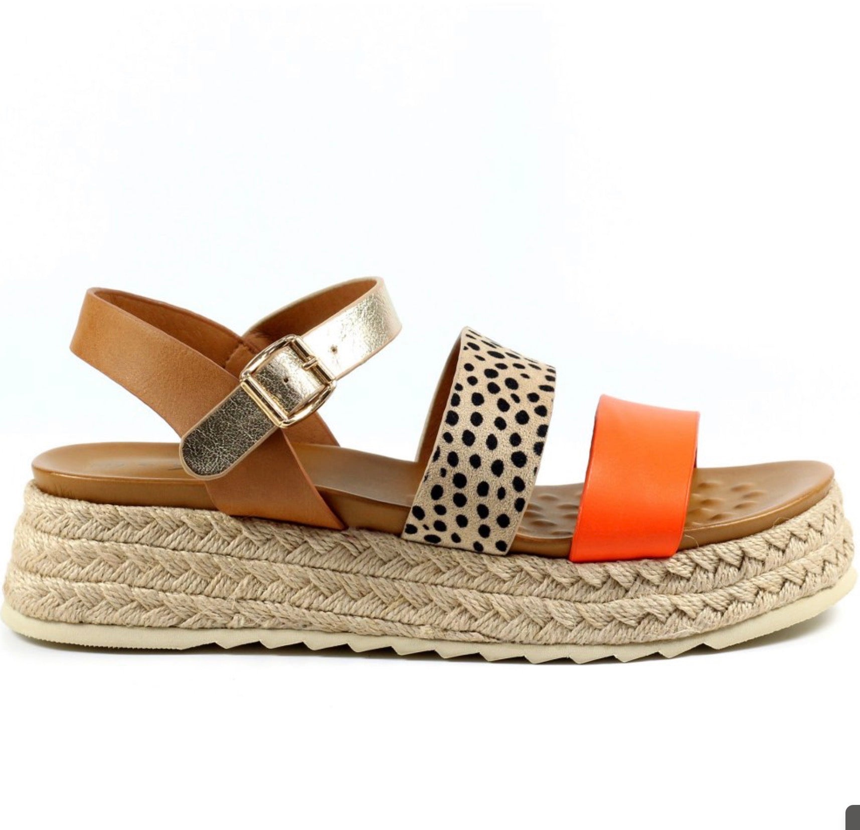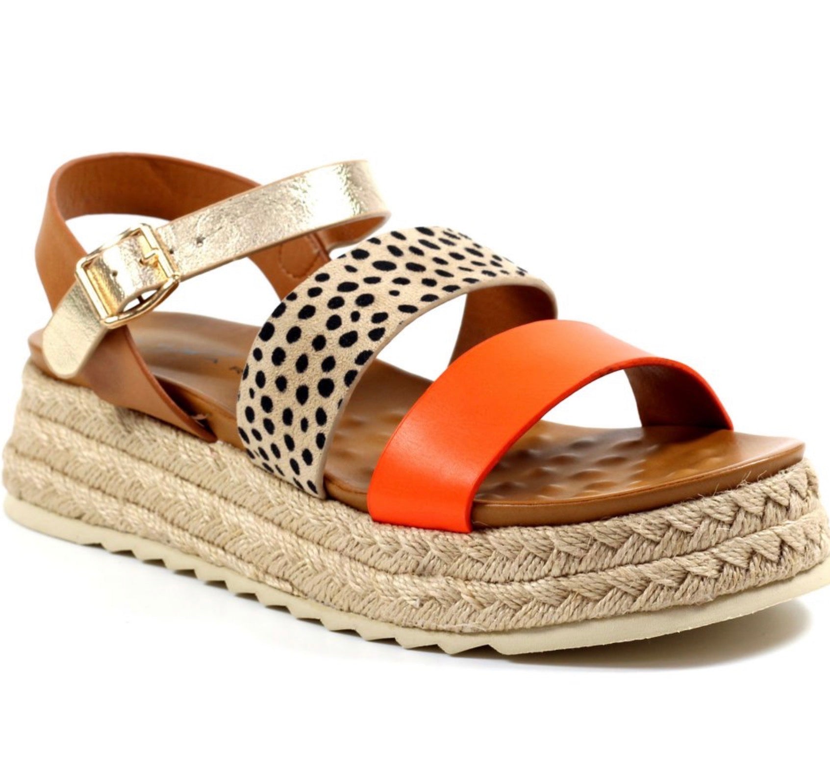 Add a pop of colour and print to your wardrobe wearing the orange summer chunky sandal. Crafted from faux leather with a faux leather lining, these sandals feature an adjustable buckled ankle strap for a personalized fit. The padded insole and supportive platform ensure day-long comfort. The spotted print alongside orange, gold and tan straps adds a playful touch that is sure to turn heads this season.