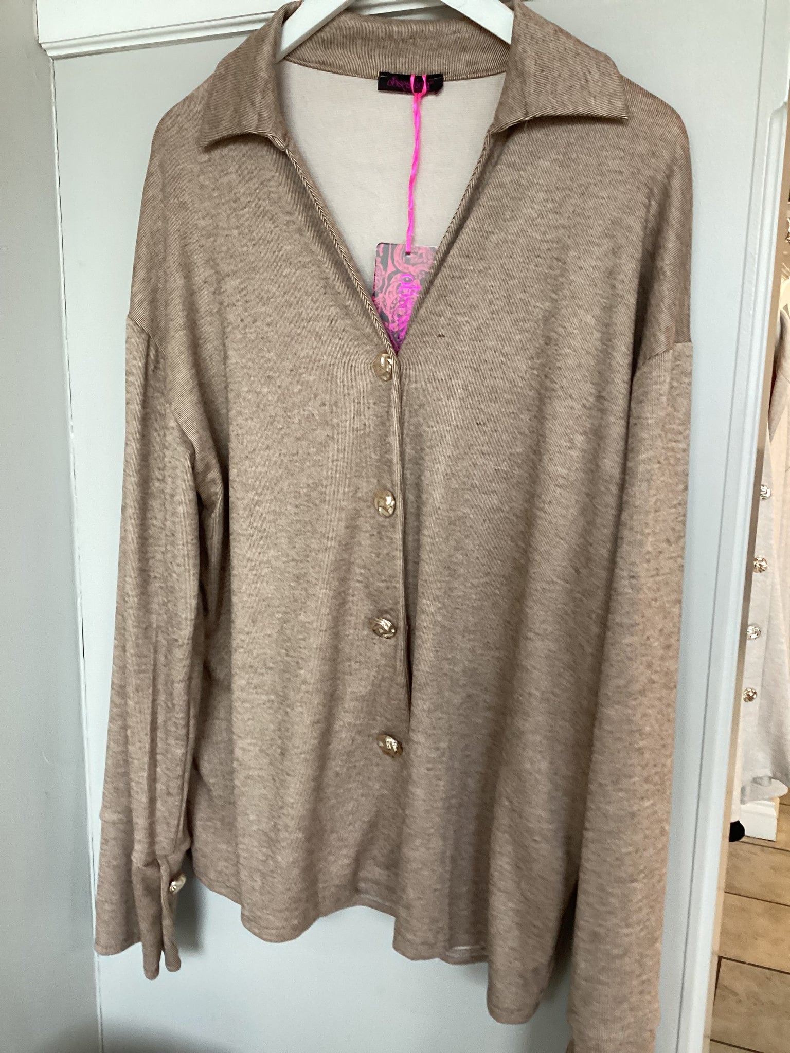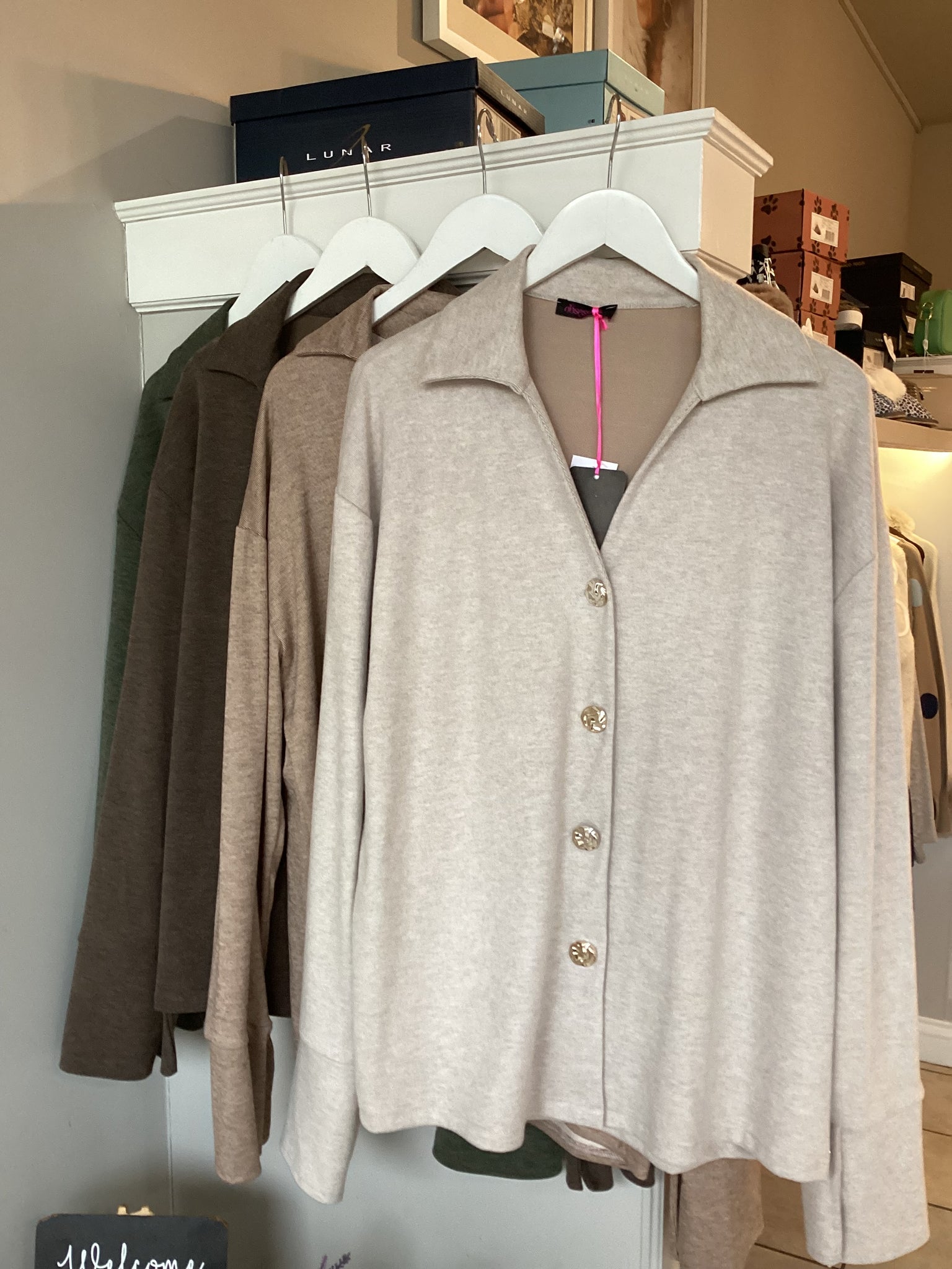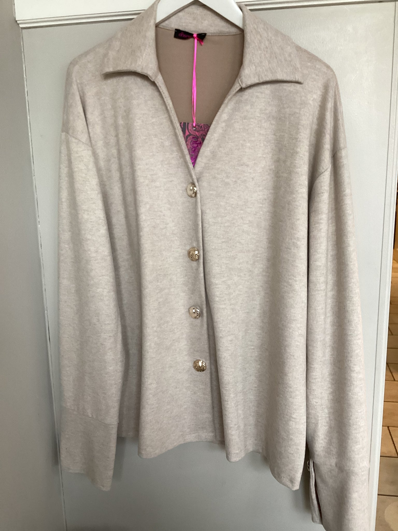 A chic, relaxed-fit cardigan in a soft knit, featuring a smart collar and luxe gold-tone buttons. Designed with an easy, throw-on shape, it works perfectly as a lightweight jacket or a cosy layering piece. Effortlessly stylish for everyday wear.