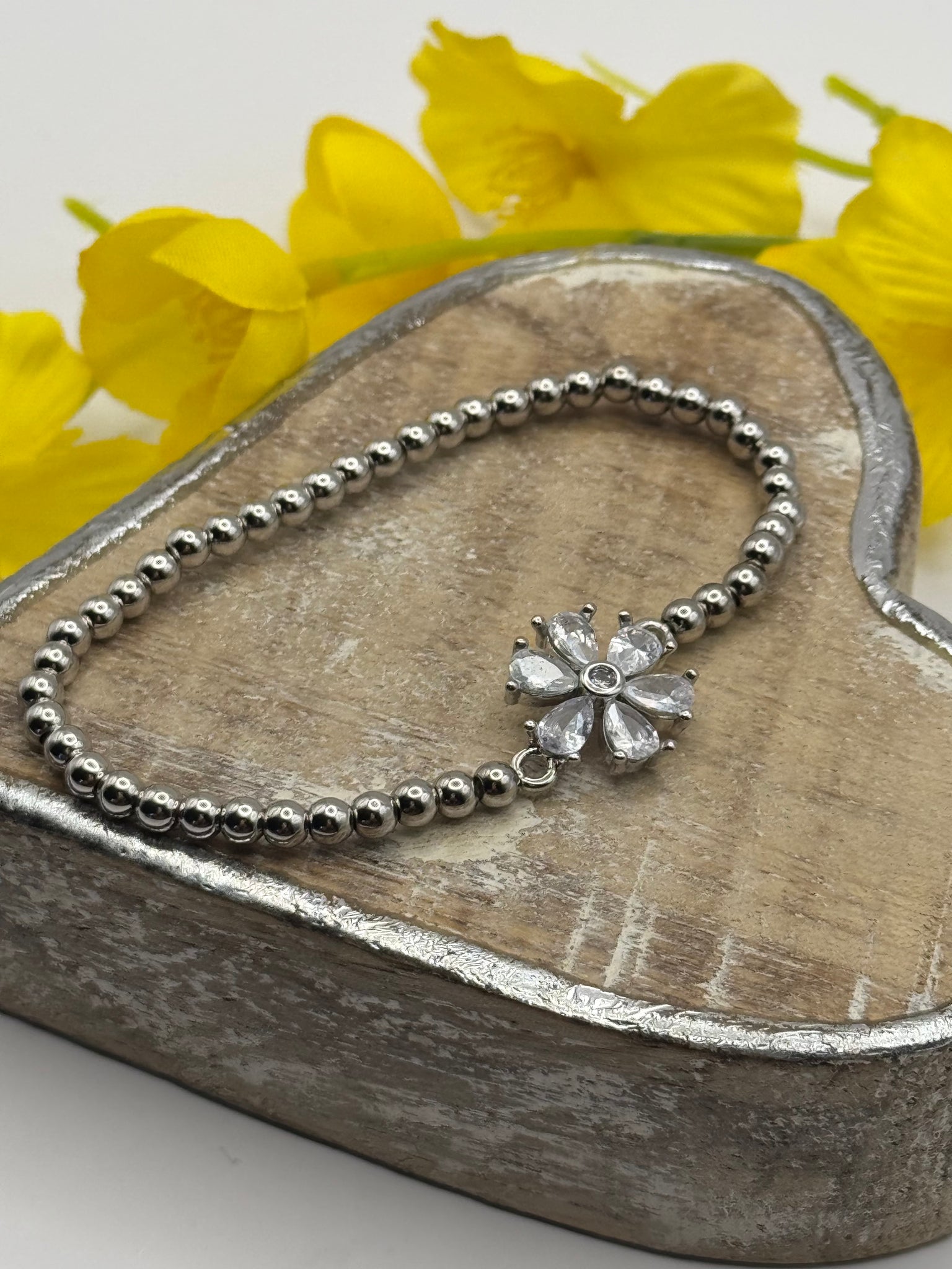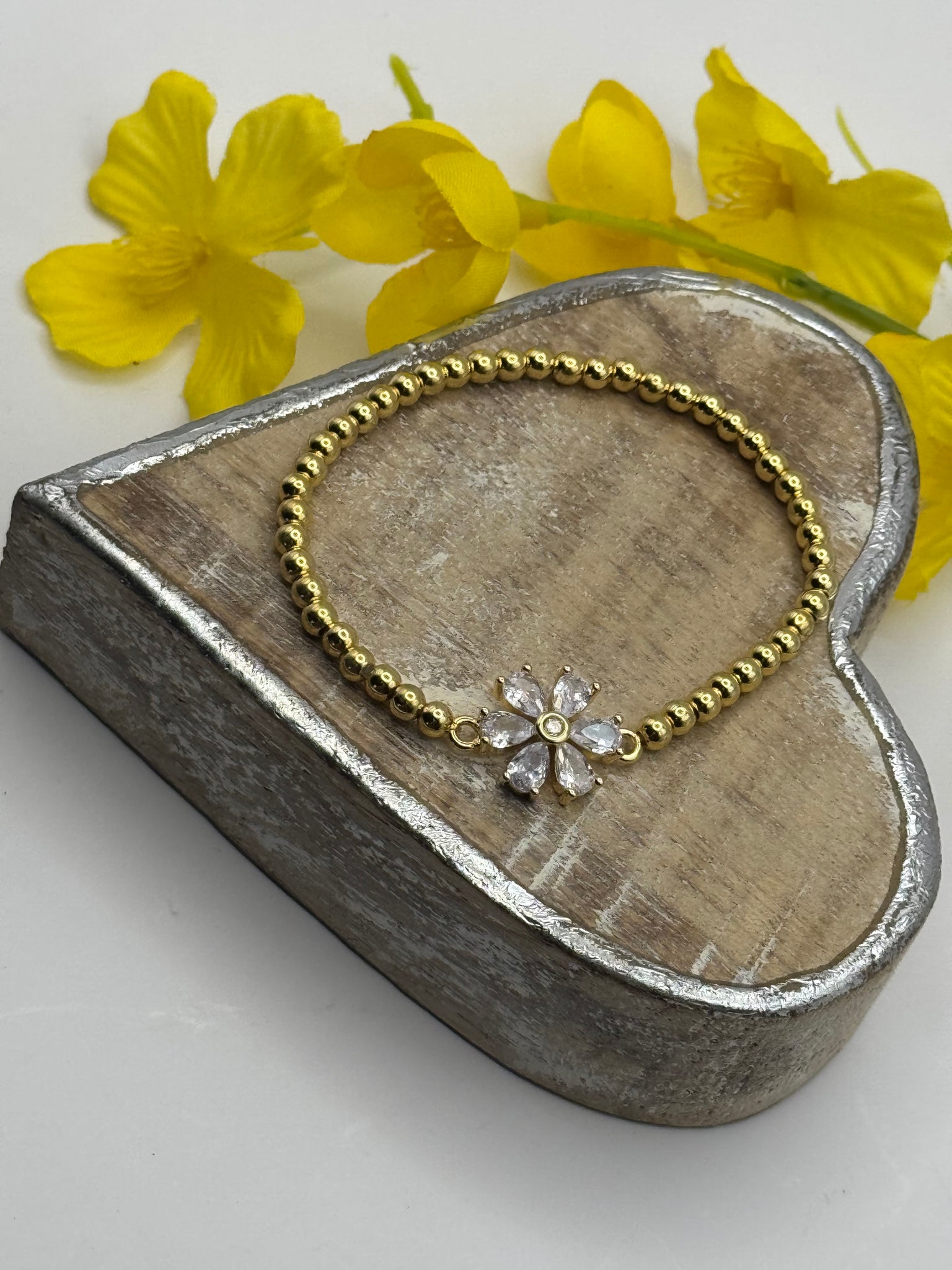 Elasticated ball bracelet with diamanté flower detailing. Available in gold or silver