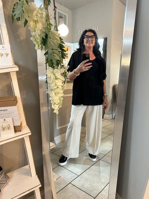 Stunning top from Malissa J. Available in cream, taupe and black. Team with Malissa J’s fisherman trousers to complete the look. One size that would fit up to a size 20
