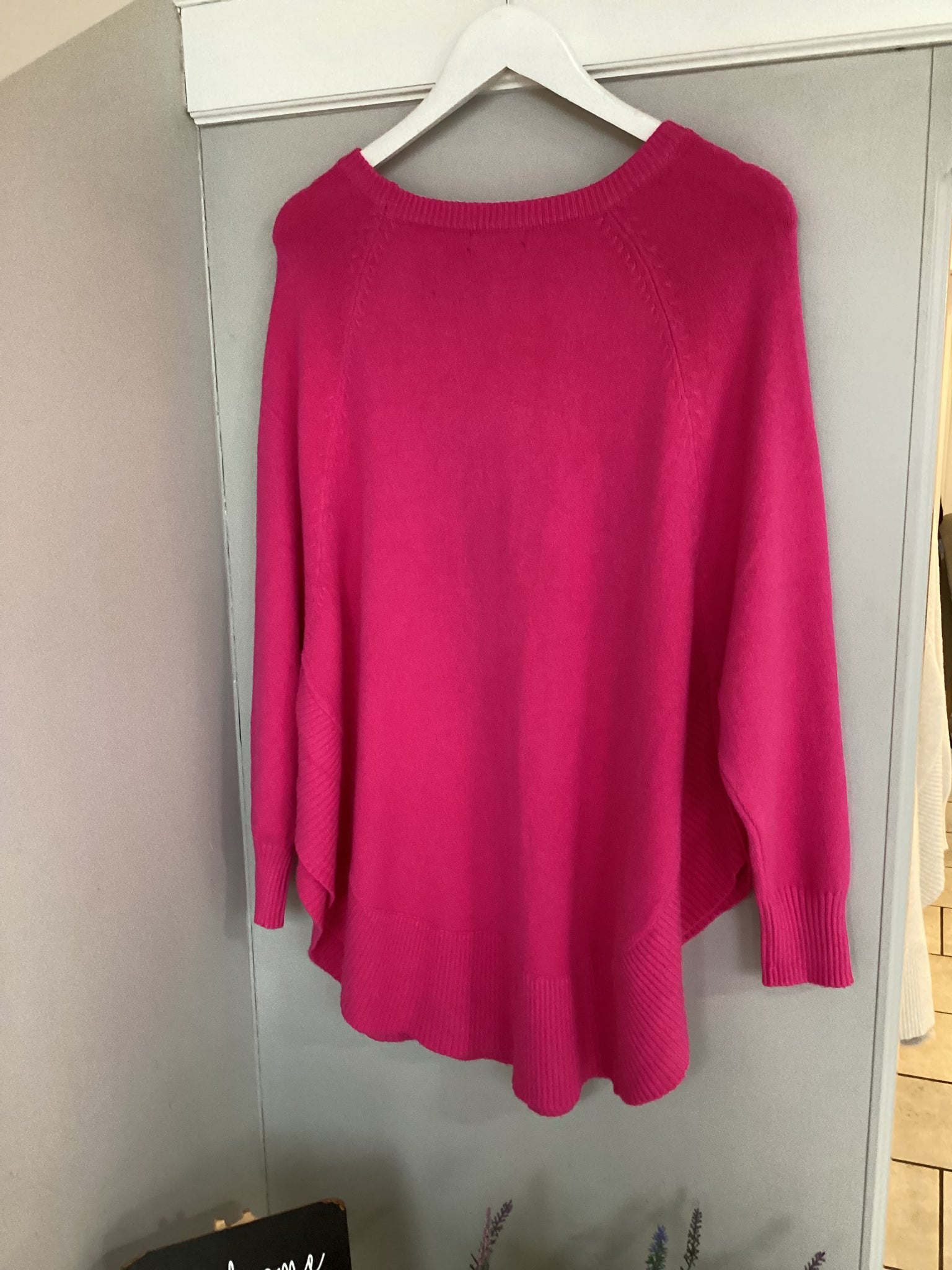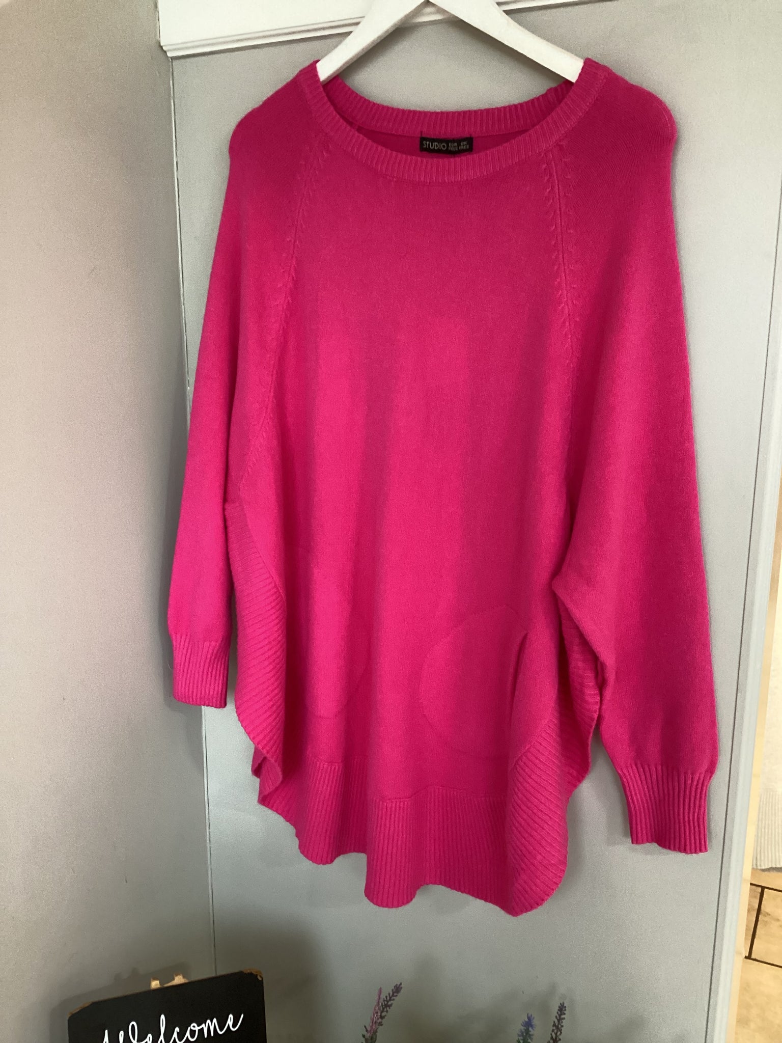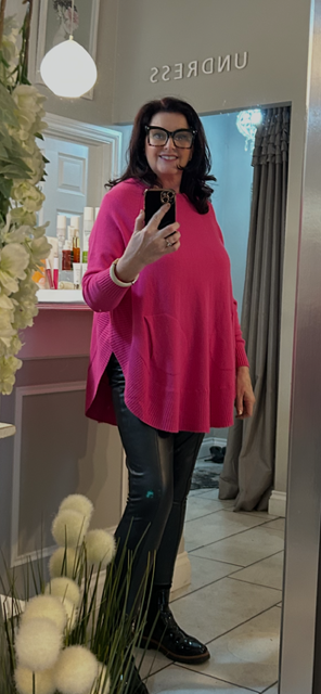 This soft knit jumper features a classic round neckline with a relaxed, comfortable fit. Designed with a rounded hemline, it drapes smoothly over the body and provides a flattering, classy easy-to-wear silhouette. Functional front pockets add both practicality and casual style, making it ideal for everyday wear. Finished with long sleeves and subtle knit detailing, this jumper combines comfort with a simple, modern look.