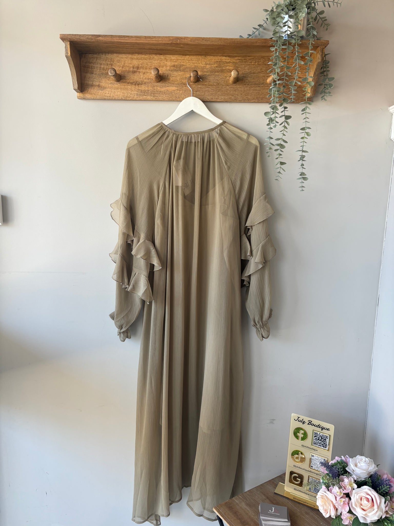 Discover this women's ruffle maxi dress featuring a relaxed fit, V-neckline with tie detail, and layered long sleeves. Designed for comfort and versatile occasions, its flowing silhouette ensures effortless movement and style.