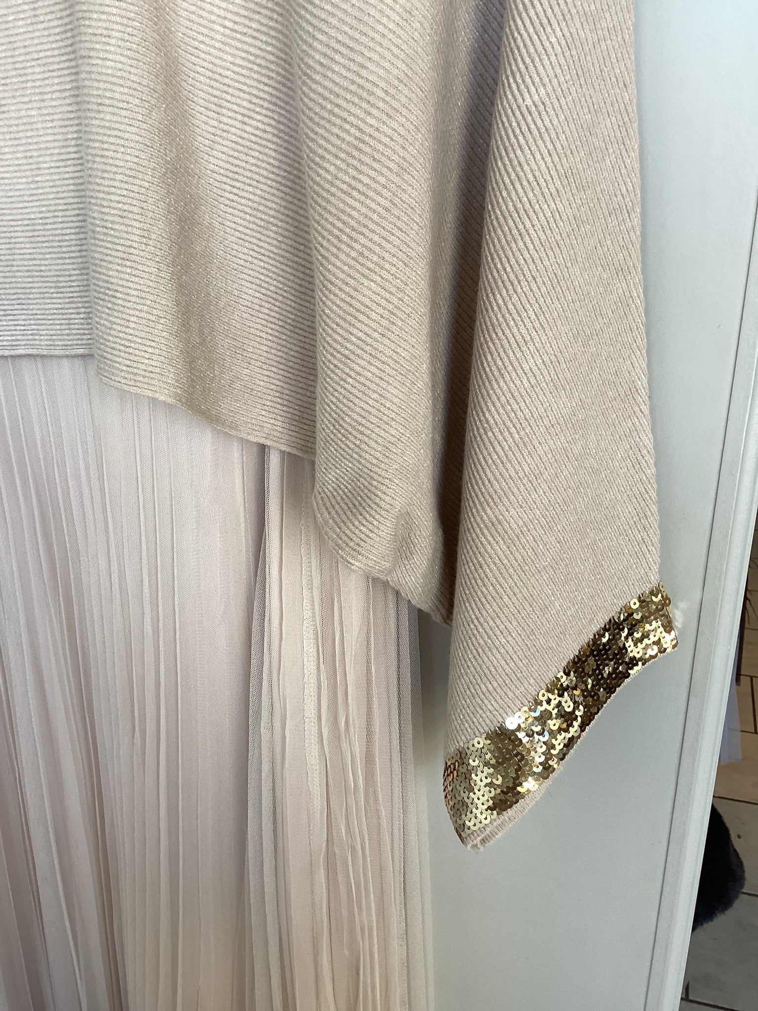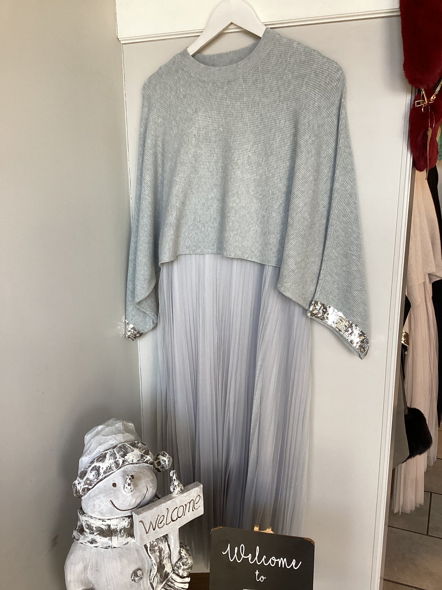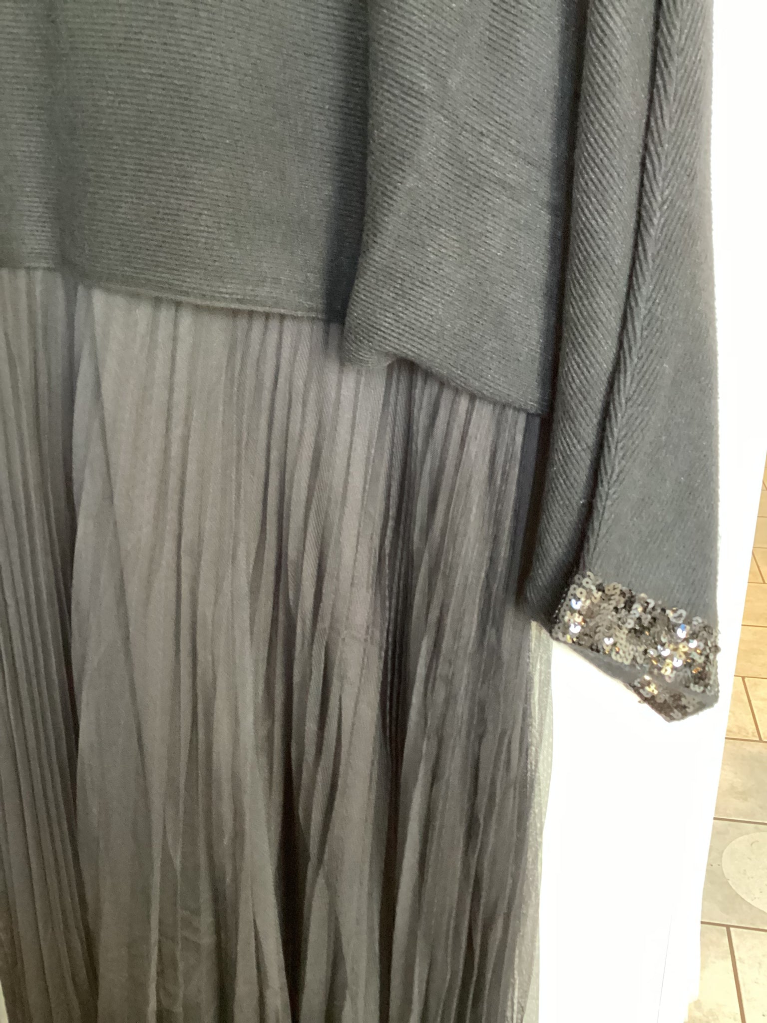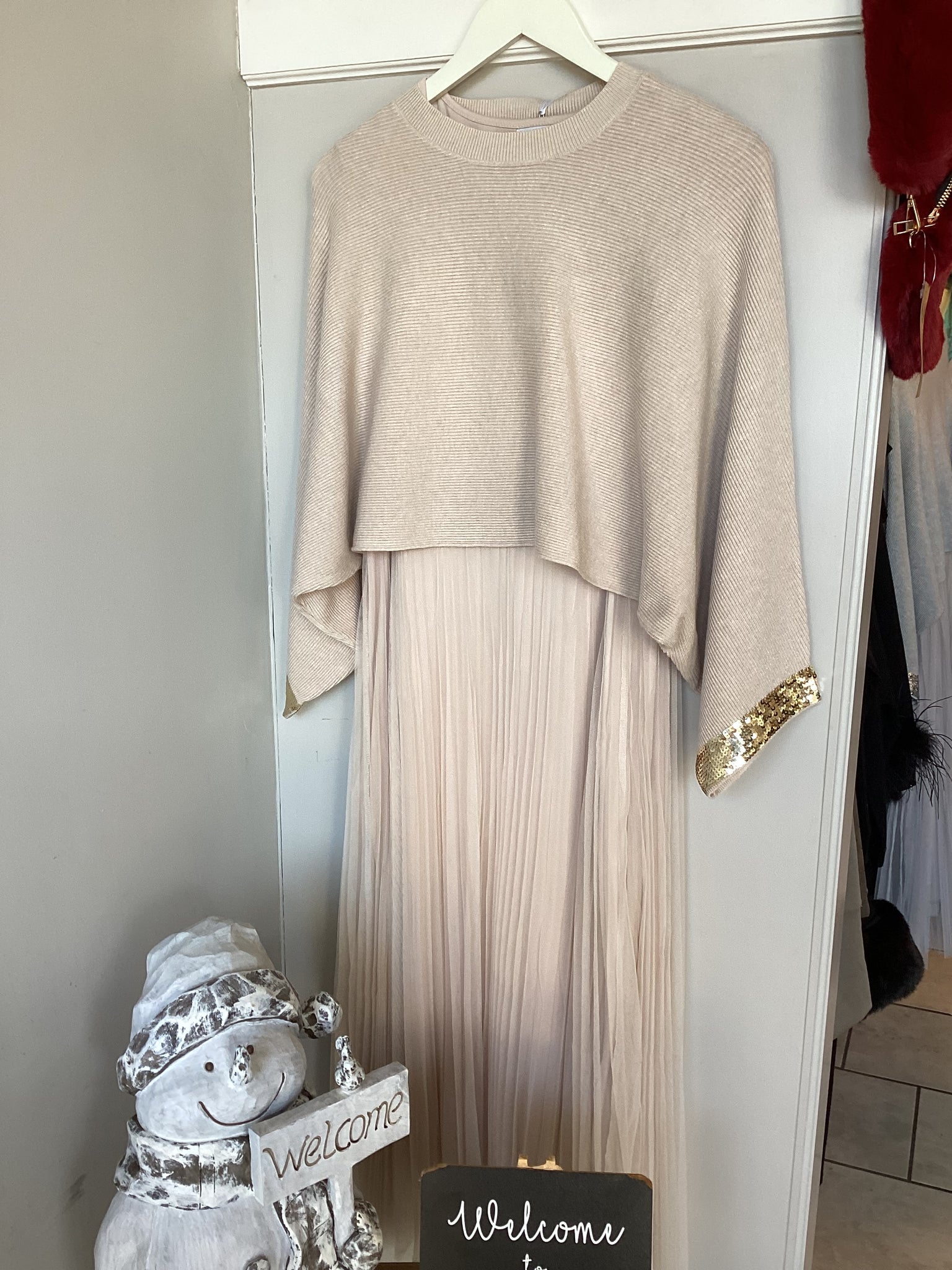 Elegant pleated midi dress layered with a soft ribbed knit jumper, finished with subtle sequin cuff details. Perfect for effortless, chic styling.