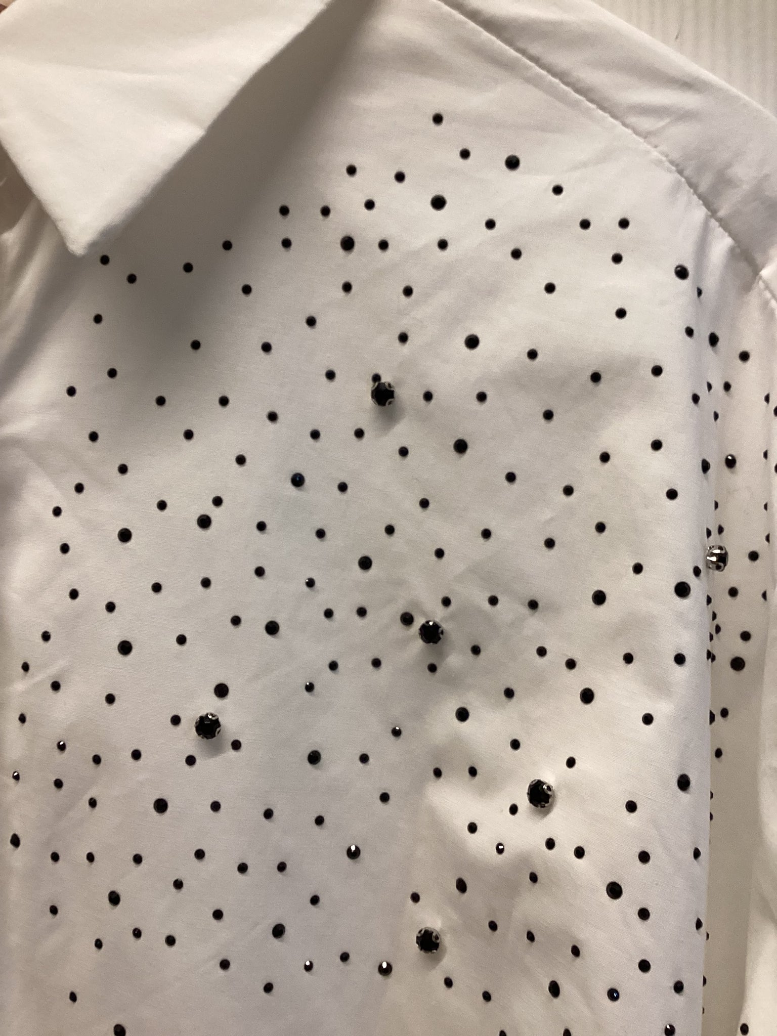 A crisp white button-up shirt elevated with delicate speckle embellishments for a subtle statement finish. Designed with a classic collar, concealed front placket and a relaxed, easy fit, this piece blends timeless tailoring with modern detail. Perfect for dressing up denim or adding edge to tailored trousers, it’s an effortless day-to-night staple.