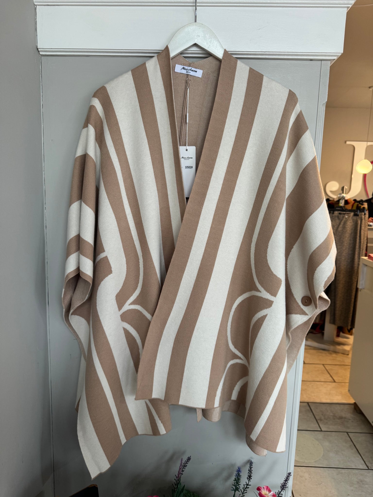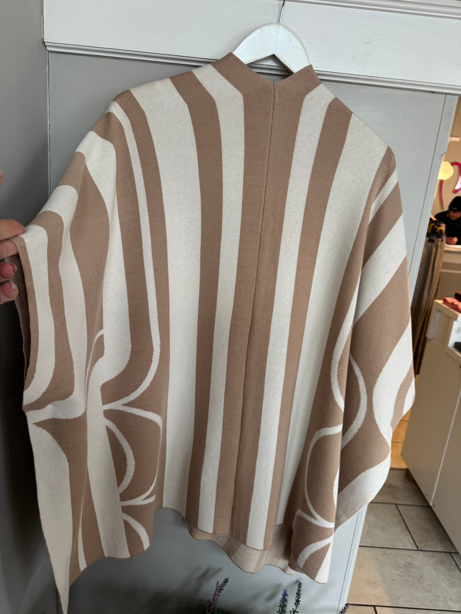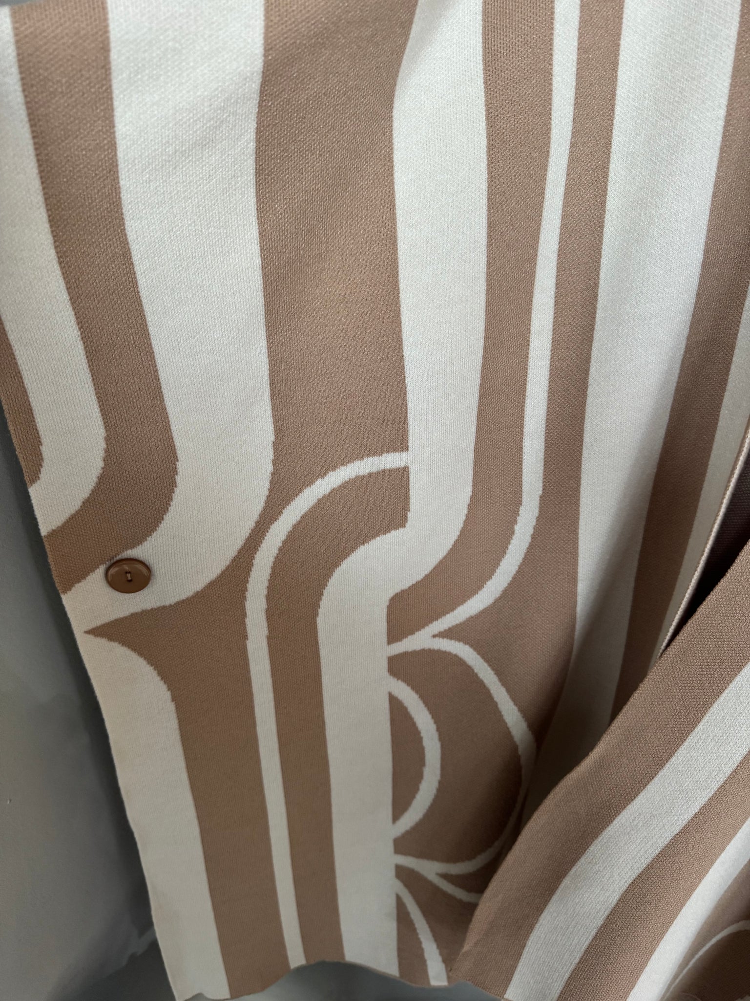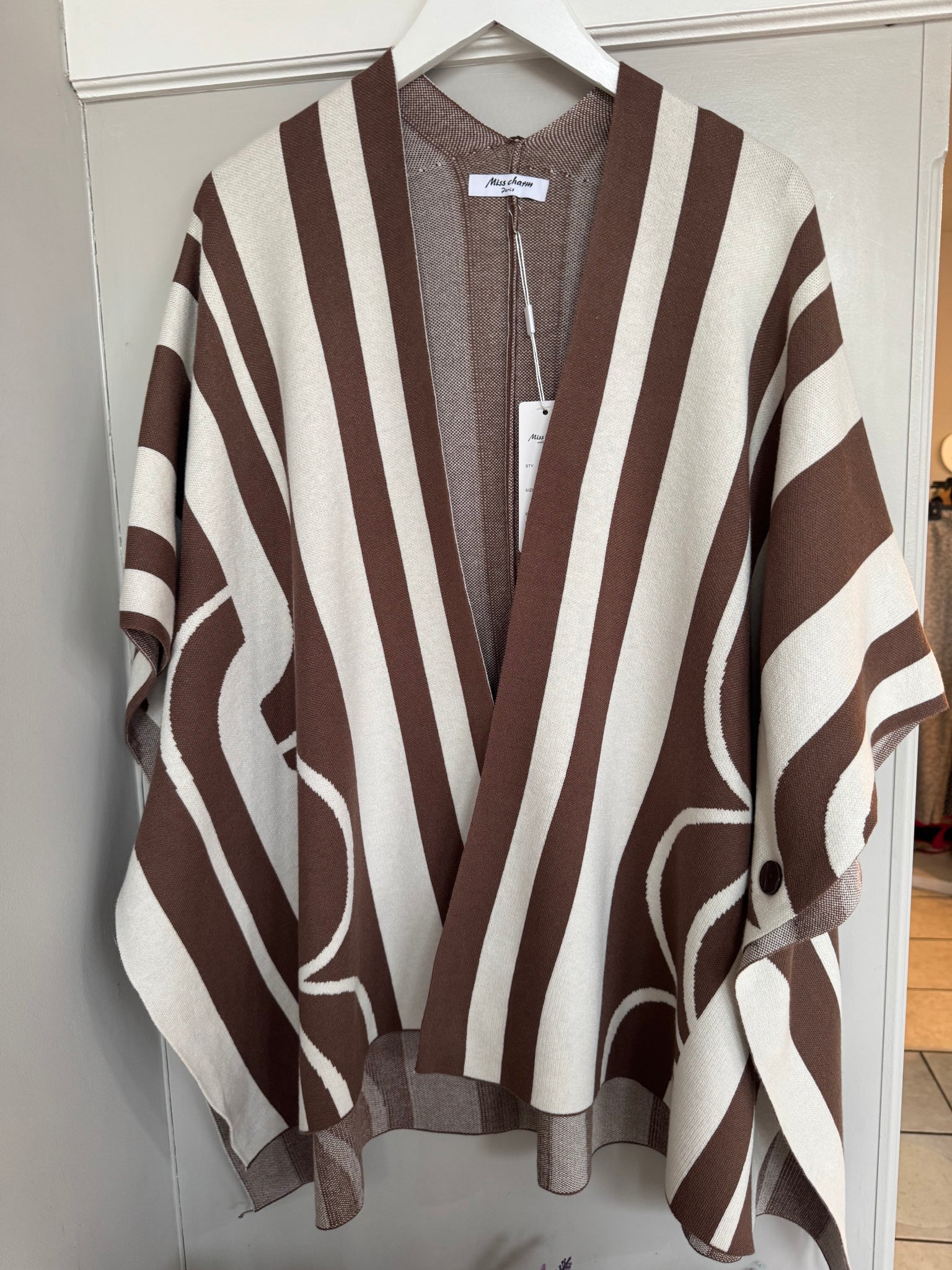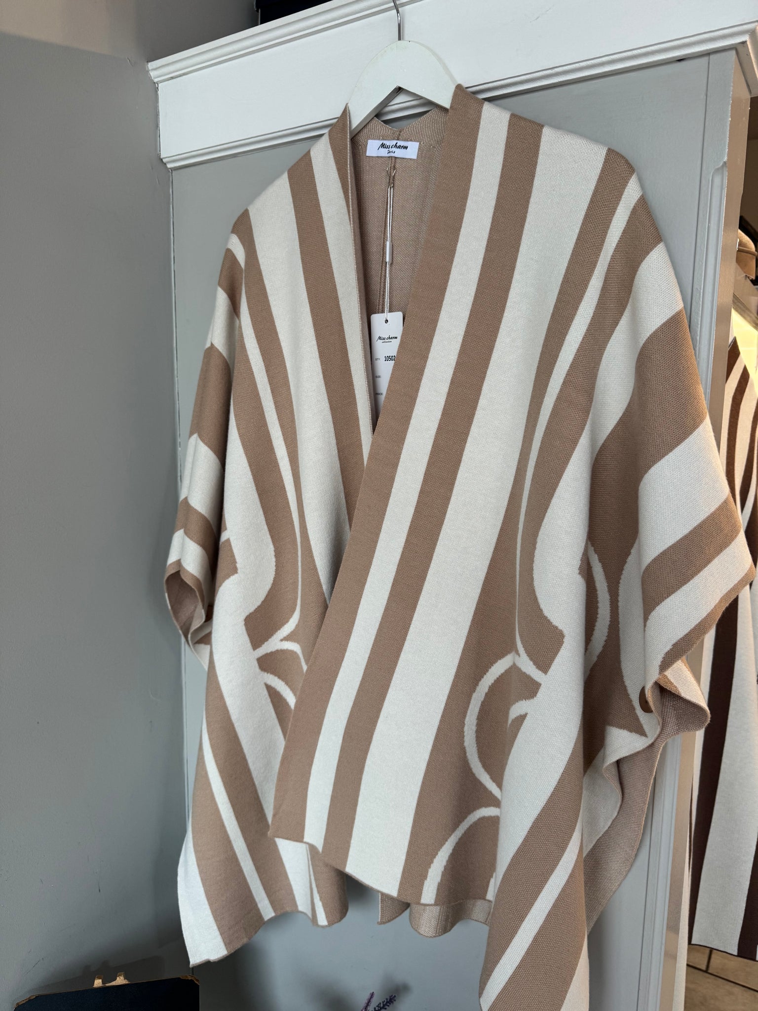 Effortlessly elegant and easy to wear, this one-size wrap is a versatile layering piece for any wardrobe. Designed with a flattering open-front silhouette, it drapes beautifully over the body for a relaxed yet refined look. The soft knit fabric features a bold striped pattern with flowing curved accents, creating visual interest while remaining timeless.