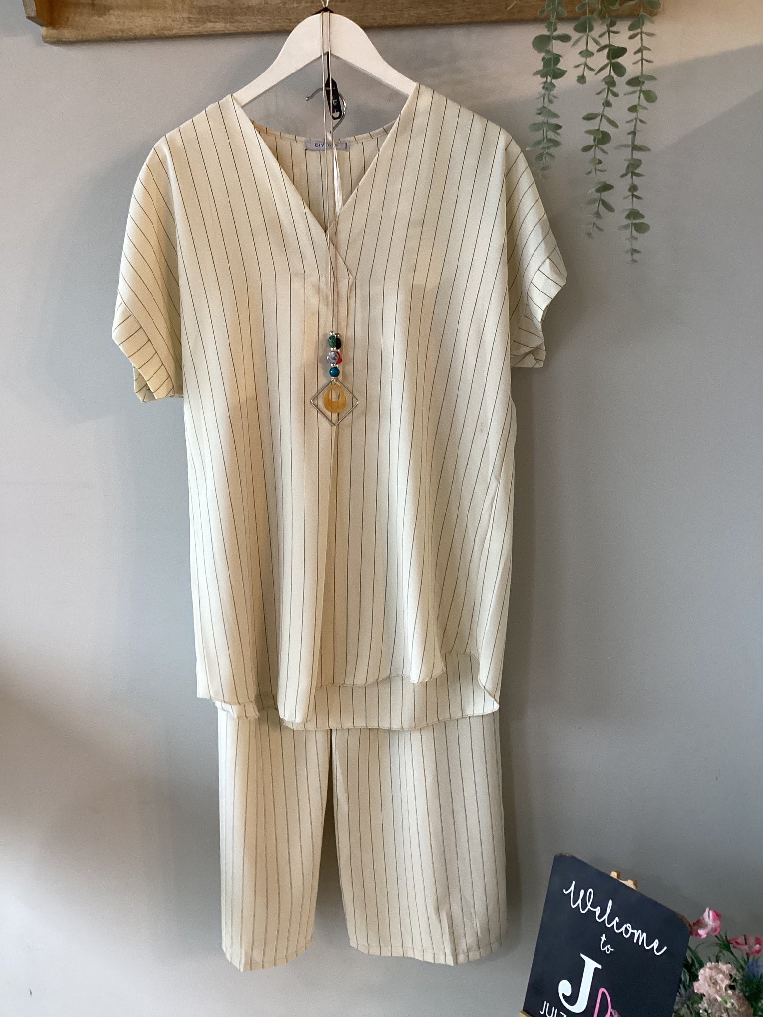 V Neck Pinstripe Suit with necklace - Elastic waist.